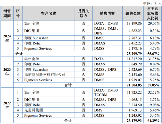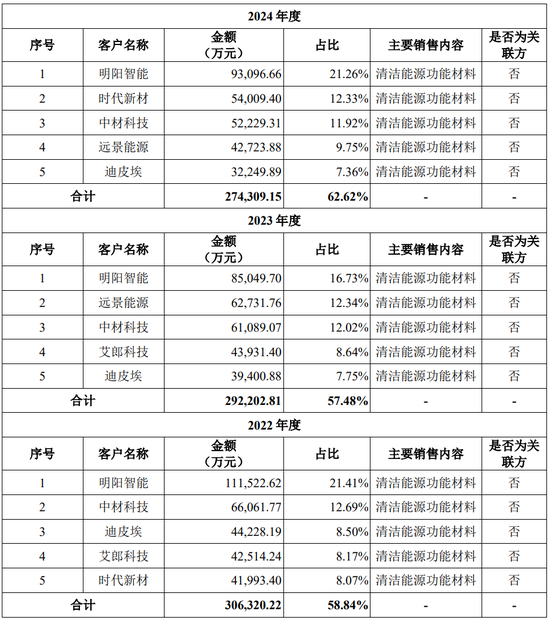 报告期内,公司前五名客户的销售收入占主营业务收入的比例分别为58.84%、57.48%及62.62%。公司客户集中度较高,主要是下游风电整机及叶片行业集中度较高所致。