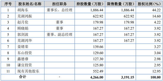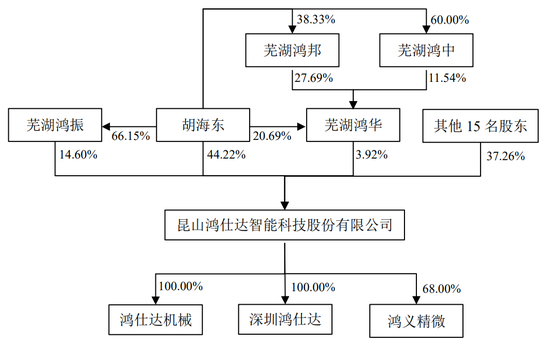 胡海东直接持有公司1,886.4397万股股份,占公司总股本的44.22%;同时通过持有芜湖鸿振、芜湖鸿华合伙份额并担任执行事务合伙人间接控制公司18.52%的表决权,合计控制公司62.74%的表决权,系公司的控股股东、实际控制人。