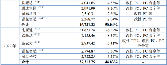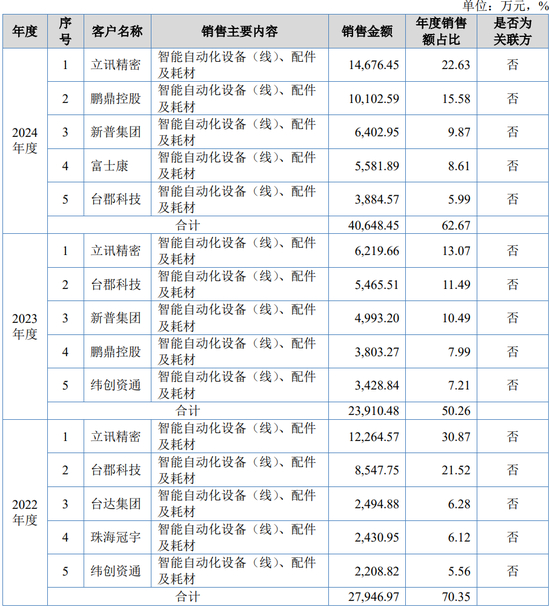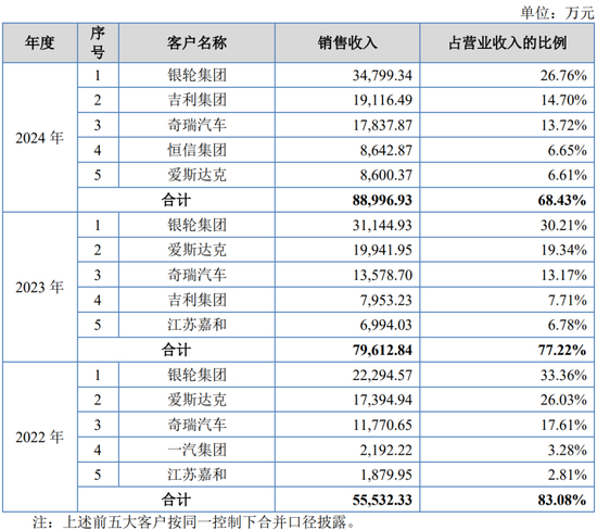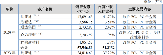 报告期内,公司前五大客户销售收入分别为37,313.75万元、46,731.33万元和57,946.86万元,占比分别为44.83%、50.04%和51.31%,其中,对第一大客户比亚迪的营收占比分别为26.22%、37.29%和41.70%,客户较为集中。