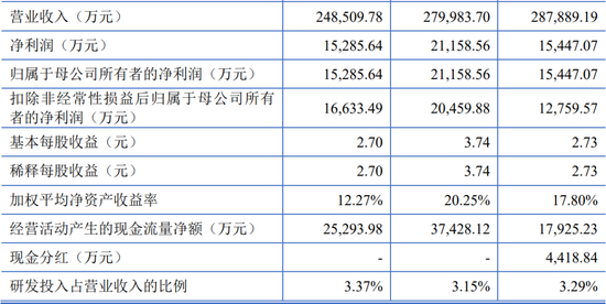 报告期内,公司营业收入分别为287,889.19万元、279,983.70万元和248,509.78万元,归属于发行人股东扣除非经常性损益后的净利润分别为12,759.57万元、20,459.88万元和16,633.49万元。