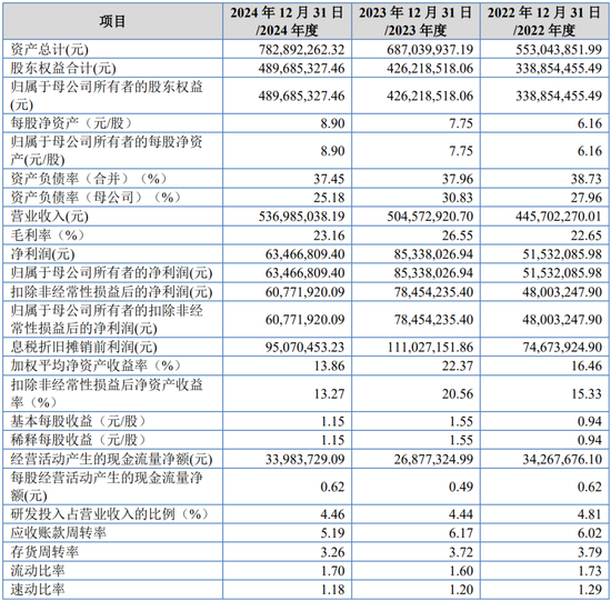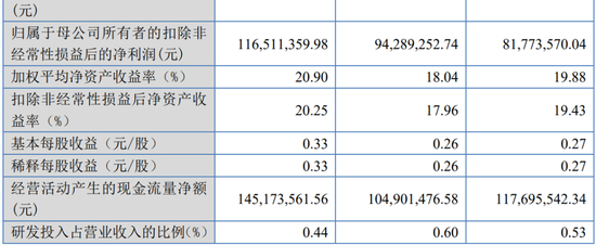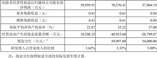 报告期内,公司营业收入分别为526,743.69万元、512,395.29万元、443,879.18万元,归属于发行人股东扣除非经常性损益后的净利润分别为57,904.19万元、70,370.41万元和59,959.91万元。