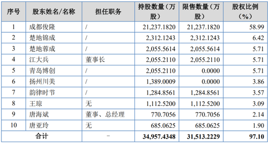 成都俊隆持有公司212,371,820股股份,占公司股份总数的58.99%,为公司控股股东。江大兵、王伟鉴通过江大兵直接持有的公司股份、实际控制的成都俊隆、韵律时节、楚地蓉成、楚地锦成及其一致行动人王琼直接持有的公司股份,合计控制公司83.4929%的表决权。江大兵、王伟鉴为公司实际控制人。