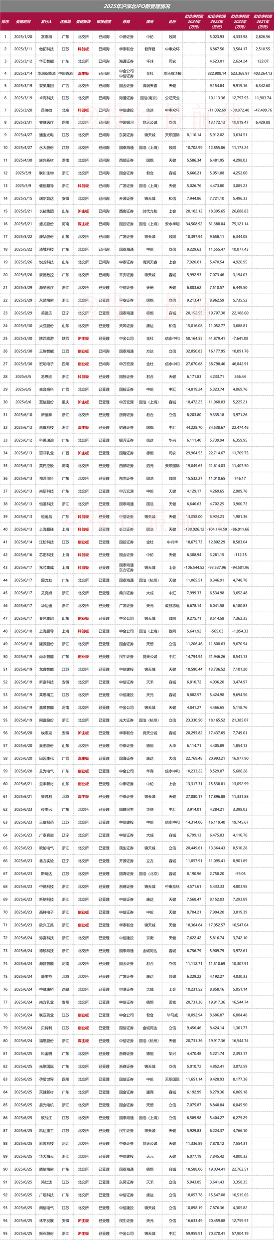 截止目前,上交所受理了16家(主板7家、科创板9家),北交所受理62家,深交所受理17家(主板6家、创业板11家),沪深北共计受理95家,具体如下: