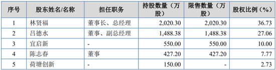 林贤福直接持有的公司股份为2,020.30万股,占公司总股本的36.73%,并通过担任公司员工持股平台宜启新的执行事务合伙人间接控制公司550.00万股股份,合计实际控制公司2,570.30万股股份,占公司总股本的46.73%;吕德水直接持有的公司股份为1,488.38万股,占公司总股本的27.06%。