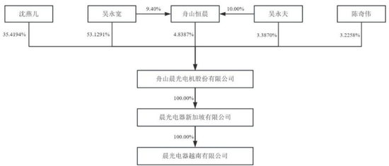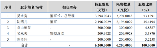 吴永宽直接持有公司53.1291%的股份,为公司控股股东;吴永宽通过舟山恒晨间接控制公司4.8387%的股份;吴永宽之配偶沈燕儿直接持有公司35.4194%的股份;吴永宽和沈燕儿合计控制公司93.3872%的股份,为公司的实际控制人。