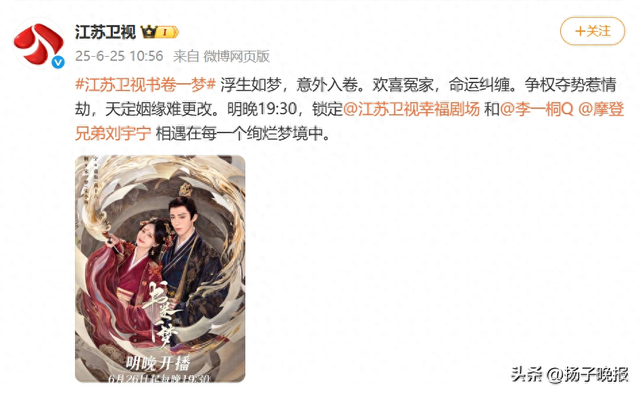 6月25日,江苏卫视突然发布消息,官宣李一桐、刘宇宁主演的《书卷一梦》将于26日晚登陆该台幸福剧场。