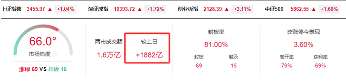 2、沪指涨1.03%创年内新高、创业板指放量大涨3.11% 金融股全线爆发 两市成交额达1.6万亿