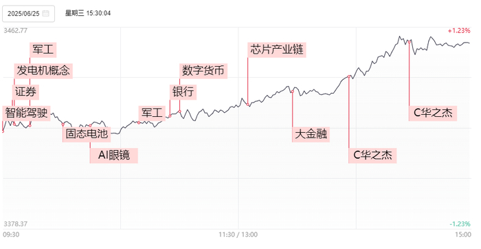 指数震荡走高,创业板指涨超3%、沪指涨超1%。截至收盘,沪指涨1.03%,创下年内新高,深证成指涨1.72%,创业板指涨3.11%。两市个股涨多跌少,上涨个股超3900只;两市全天成交1.6万亿元,较上一日放量成交1882亿元,内资主力资金净流入25.96亿元;两市涨跌中位数为0.6%。盘面上,金融股集体爆发,多元金融、券商、跨境支付、银行等板块大幅拉升,湘财股份等涨停,工、农、中、建四大行齐创历史新高;军工板块走强,兵装重组、航母、军工信息化等方向涨幅居前,长城军工、中兵红箭等多股涨停;AI眼镜概念震荡走高,智立方等涨停;固态电池板块上攻,天际股份等涨停;深海科技概念走强,国瑞科技涨停;房地产、算力、芯片、汽车产业链、AI应用等方向纷纷上扬。跌幅方面,油气股持续回调,准油股份等再度跌停;港口航运板块走低,宁波海运大跌;化工股表现弱势,广康生化领跌;CRO、阿尔茨海默、减肥药等医药股集体下行,联化科技一度跌停;影视传媒、林业等少数板块飘绿。消息面上,1、伊朗和以色列宣布正式停火;2、9月3日天安门举行盛大阅兵,将安排部分无人智能等新型作战力量参阅;3、央行等六部门联合印发《关于金融支持提振和扩大消费的指导意见》;4、多家企业披露固态电池最新进展;5、小米首款AI眼镜即将发布。