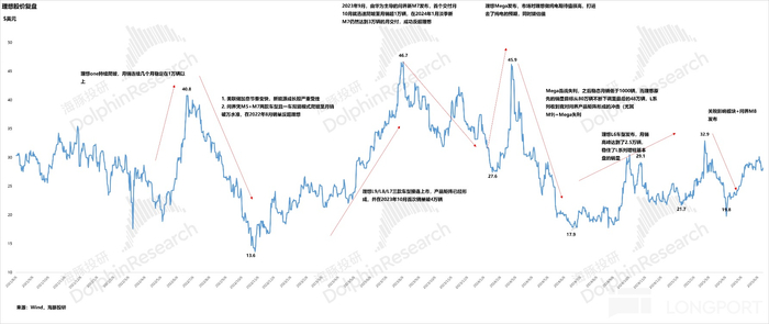 但在看到Mega上市稳态月销不到1000辆时,又带来了对理想的利润预期和估值倍数的双杀时刻,最后在2024年6月初来到了历史低点18美元,而后理想通过做车型结构下沉(理想L6),挽救了饱受问界冲击的理想增程基本盘,股价也持续在20-30美元之间波动。