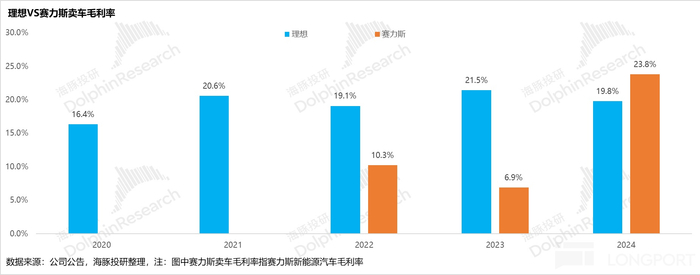 而赛力斯更高端的车型结构,意味着更高卖车单价,进一步意味着更高卖车毛利率:2024年整体卖车达到了24%(实际上问界品牌的卖车毛利率预计会更高,预计在26%左右)。