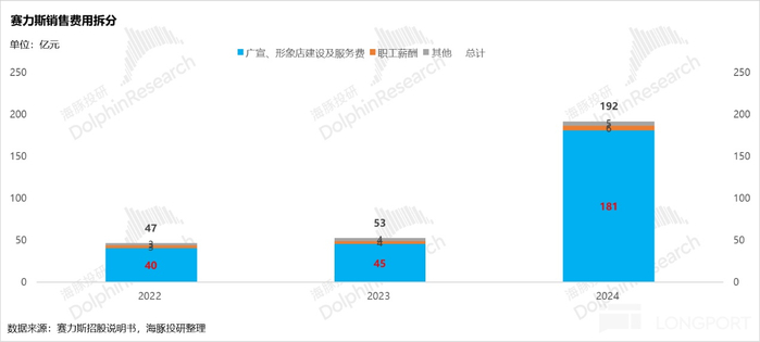 所以由此看出,2024年占销售费用中94%的广宣、形象店建设及服务费,可能就是赛力斯基于问界品牌与华为渠道分成的大头。