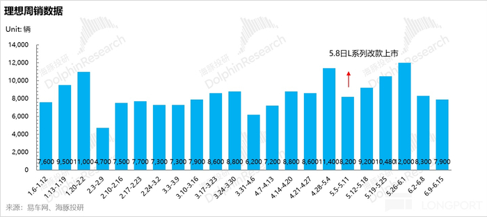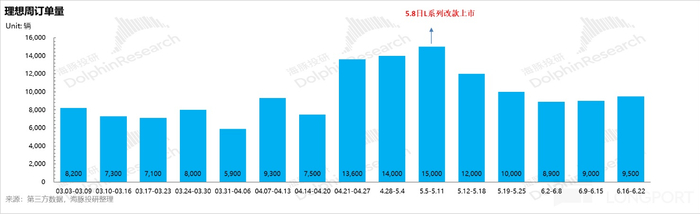 从目前理想的周销和周订单趋势来看,理想目前L系列增程基本盘并不乐观,5.8日L系列改款上市后,理想周订单量高峰也就1.5万辆,改款上市后不到两周订单量已经下滑到不到1万辆,而这样的周订单量对应之后的月销量也仅4万出头。