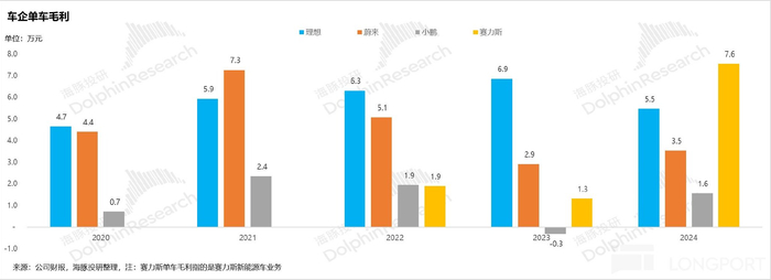 也就是说,每卖一辆车,2024年理想仅能赚到5.5万元,而赛力斯(新能源车)可以赚到7.6万元,其中问界品牌的单车毛利可能高达10万元!问界在华为加持下的品牌溢价力可见一斑。