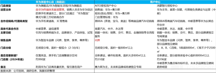 1)AITO授权用户中心:赛力斯负责合作经销商的招募工作,但规划/选址/授权和门店管理标准都要经过华为审批,但基本都销售问界车型,截至2024底AITO授权店有310家。