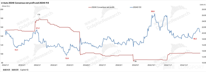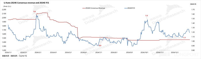 而本质上这段Mega上市之前(从2月初到3月初)股价的上涨打入的是对Mega纯电车型的高预期,带来的对于2024年利润预期和PE估值的倍数双抬升(2024E的利润预期在Mega上市前的高点达到了接近180亿,打进去了将近75万辆的2024年的交付预期,而2024E PE倍数从2月初低点15倍快速拉升至2024年3月初21倍,2024E P/S倍数也从1倍拉到了1.6倍)。