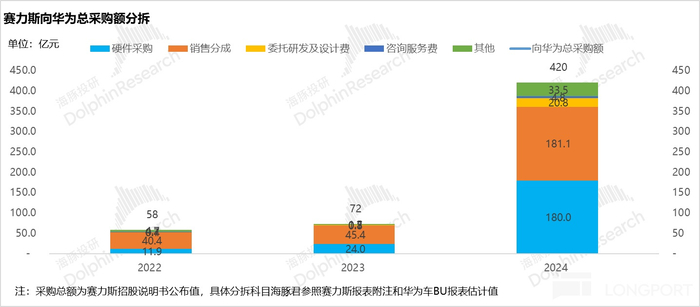 而从整体华为与赛力斯合作模式的收费关系,其实从招股书中赛力斯向华为采购额也可以推测出来,可能是分为这几方面的收费模式: