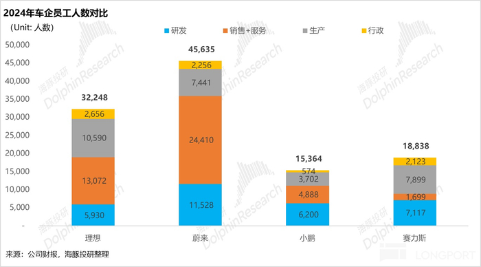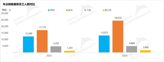 但从车企的销售+服务员工人数来看,赛力斯报表内的销服员工人数2024年仅1700人,是理想销服人数的13%,是同为经销模式小鹏的不到一半,2024年销售人员占赛力斯总员工的人数也是不到9%,大幅低于新势力普遍30%-50%的比重。