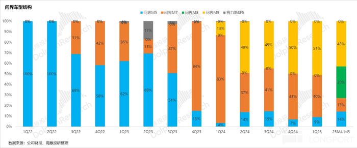 而在2025年4-5月赛力斯另一款重磅产品问界M8上市时,问界M8+M9两款30万+的产品,反而在问界车型结构中占比达到了73%。