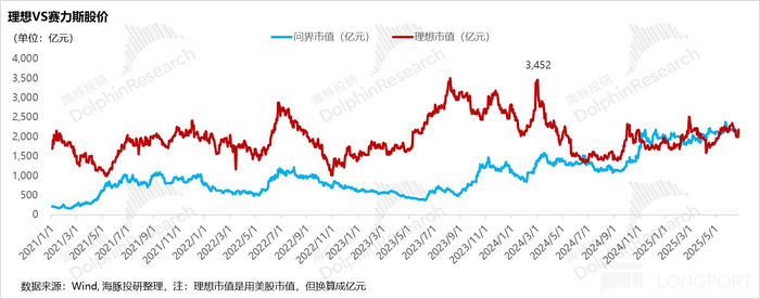 但海豚君认为,理想i8凭借更高的产品力(更高的续航,更大的空间)+家用SUV的定位+超充站布局相对完善,在7月上市,到8月正式交付月可能拿下5000辆左右的销量不是太难,而6月预计理想增程系列的销量会比5月环比有所提升,所以在这个时刻市场很容易开始拔纯电的预期和整体估值(参考去年Mega发布前后出现过,纯电估值高于增程), 尤其是一旦看到理想i8月销能拿下5000辆,就会继续提高对于 9月发布的i6预期。
