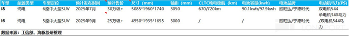 而i6作为主打20-30万元的纯电车型,目前在20-30万元的主要竞品为Model Y, 小米YU7,以及小鹏G9/乐道L60/极氪7X//智界R7等,虽然目前没有这款车型更多的信息,但海豚君预计,基于家用SUV大空间独特的定位,再加上还是有一定的品牌势能下沉优势,海豚君在中性假设下给与i6车型1万辆的月销。