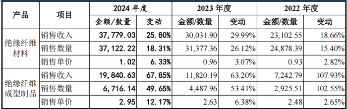 技术稀缺性赋予了公司较强的议价能力,带动产品实现量价齐升。招股书显示,2022至2024年间,广信科技绝缘纤维材料单价由0.93万元/吨上涨至1.02万元/吨,同期销量由24,878.39吨增至37,122.22吨;绝缘纤维成型制品单价由2.48万元/吨上涨至2.95万元/吨,同期销量由2,925.51吨增至6,716.14吨。