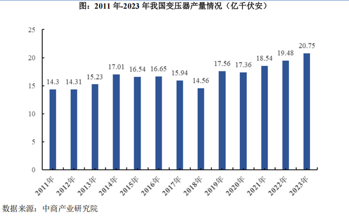 多项因素共同拉动了电力变压器等特高压输变电设备的需求, 数据显示,2023年我国变压器产量达20.75亿千伏安,同比增长6.5%,预计2024年将超过21.6亿千伏安。