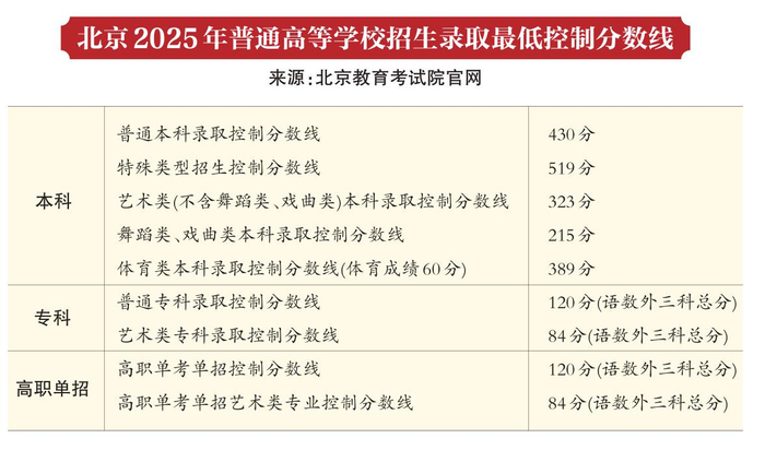 6月25日,北京教育考试院发布北京市2025年普通高等学校招生录取最低控制分数线。普通本科录取控制分数线为430分。同时,2025年北京市高考成绩查询通道和考生分数分布(一分一段)公布。