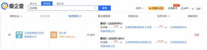 值得注意的是,江苏稻草熊文化传媒有限公司为吴奇隆与刘诗诗共同关联公司,吴奇隆在该公司担任董事长,刘诗诗间接持有该公司股份。