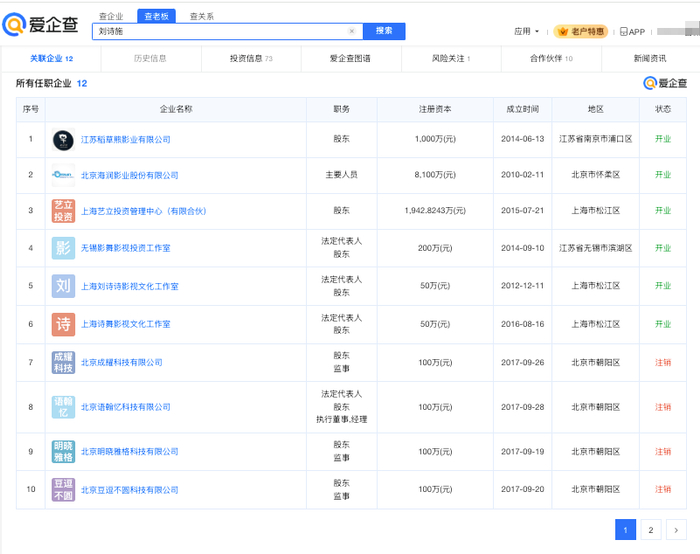 爱企查App显示,刘诗诗名下关联10余家企业,其中超半数为开业状态,包括北京海润影业股份有限公司、江苏稻草熊影业有限公司、上海刘诗诗影视文化工作室等,刘诗诗为上述企业股东或投资人。吴奇隆名下关联的九江隆之心影视文化工作室(有限合伙)、江苏稻草熊文化传媒有限公司均已注销。