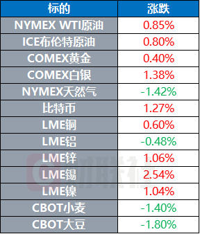 COMEX黄金期货涨0.4%,报3347.3美元/盎司。COMEX白银期货涨1.38%,报36.225美元/盎司。