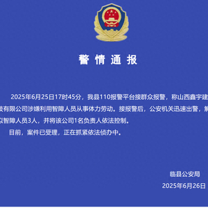 2025年6月25日17时45分,我县110报警平台接群众报警,称山西鑫宇建材科技有限公司涉嫌利用智障人员从事体力劳动。接报警后,公安机关迅速出警,解救疑似智障人员3人,并将该公司1名负责人依法控制。