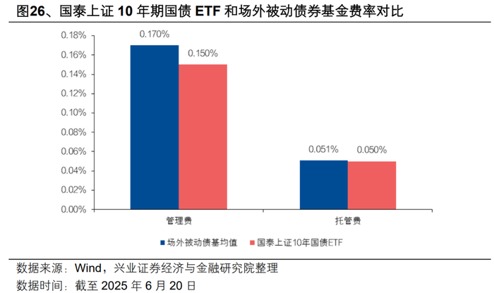 3)债券型ETF当前都免收申购赎回费,并且也没有销售服务费。截至2025Q1末,29只债券ETF产品中有26只均采用“0.15%管理费+0.05%托管费”的费率模式,低费率模式成为主流,有利于吸引投资者参与配置、推动债券ETF发展。虽然有七成多其他场外被动指数债基产品也采取0.15%管理费和0.05%托管费的收费模式,但是在申购时也仍会收取一定比例费率,因此相对来说债券型ETF承担了更少的投资成本。
