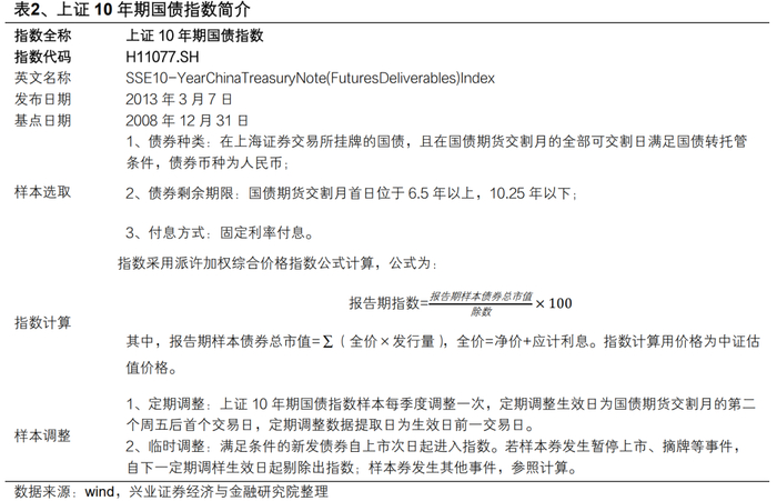 上证10年国债指数(H11077.SH)由上交所披露,该指数样本券由剩余期限介于6.5年以上10.25年以下、且在上交所挂牌的国债组成,该指数可作为连通国债期货与现货的桥梁。