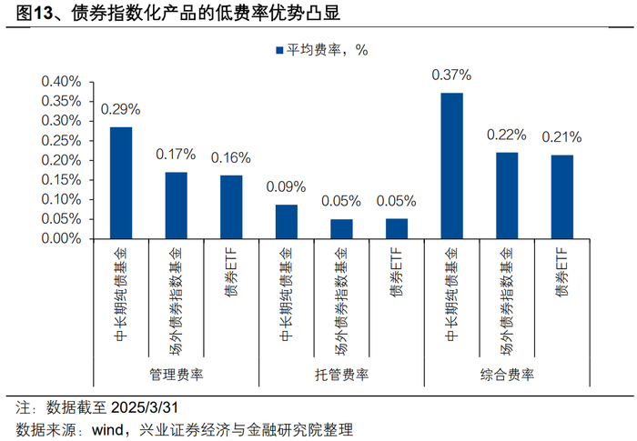 3)债券指数化产品在管理、托管等方面的费率相较主动债基更低。债券指数基金的投资策略相较于主动型债基更为稳定,因此在管理和托管费用相较主动型债基也会更低。截至2025Q1末,场外债券指数基金和债券ETF的综合费率分别为0.22%和0.21%,相较于中长期纯债基金0.37%的平均综合费率有明显优势。