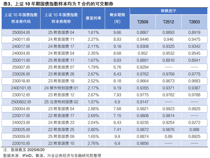 截至2025年6月20日,上证10年期国债指数共有17支样本券,剩余期限为6.76年~9.9年不等,全部为T2509、T2512、T2603合约的可交割券。而T2512合约另外一支可交割券220019.IB则由于付息月份在3月和9月,不满足“在国债期货交割月的全部可交割日满足国债转托管条件”,而不在上证10年期国债指数样本券范围内。上证10年期国债指数与T合约可交割券高度联动,使得投资者在执行现券与国债期货结合的期现策略时,现券部分可以用追踪上证10年期国债指数的ETF进行代替。若投资者要进入交割,则可以提前赎回ETF获得可交割券用于交割。