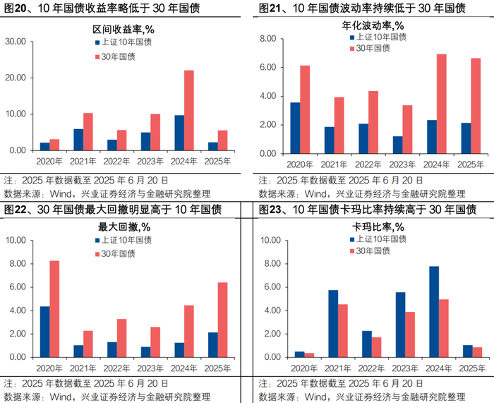 综合考虑收益和波动风险,10Y国债相较30Y国债可能更具性价比。近年来债券牛市下30Y超长国债收益率明显高于10Y国债,但其波动也更高。2020-2025年上证10年国债指数年化波动率平均是2.20%,上证30年国债指数平均年化波动率是5.23%,30年国债的波动差不多是10年期的2.5倍,区间内30年期国债平均最大回撤4.54%也远大于10年期国债的1.83%。若综合考虑指数区间年化收益率与最大回撤率之间的比率(卡玛比率),可以看出2018年以来10Y国债卡玛比率均明显大于30Y国债,相对来说可能更具性价比。