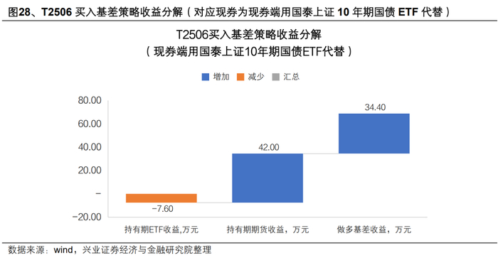 2)若投资者现券端用等量国泰上证10年期国债ETF(511260)代替现券。其他假设条件不变,测算结果显示现券端为国泰上证10年期国债ETF的看多基差策略收益为34.4万元,由持有ETF的收益-7.6万元和持有期货的收益42万元组成,考虑融资成本后的策略年化收益率为2.71%(注2)。