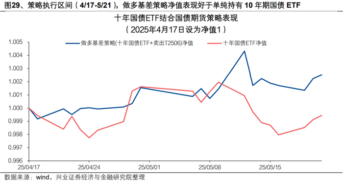 3)从策略执行区间(4/17-5/21)的净值表现来看,由于这一时期10年国债走势震荡偏弱,做多基差策略(国泰上证10年期国债ETF+卖出T2506)的净值表现好于单纯持有国泰上证10年期国债ETF。这也意味着在债市出现波动时,在单纯持有国泰上证10年期国债ETF的基础上,可以适当加入国债期货做基差策略或套保策略,有助于对冲利率风险和维持净值稳定。