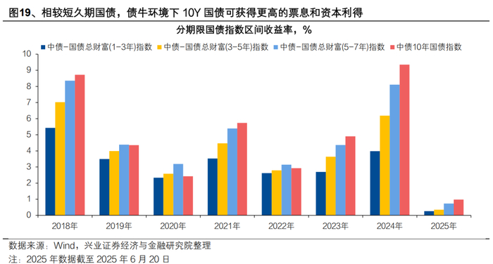 债牛环境下,10Y国债持有收益率明显高于短期限国债品种。相较于收益率较低的短久期国债来说,10Y国债票息收益相对更高,且在利率下行周期中还能带来更高的资本利得。以中债指数为例,从2018年至今中债10年国债指数持有收益率整体高于中债1-3年、3-5年和5-7年国债指数。