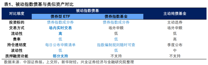 当前环境下,指数债基特别是ETF优势较为突出。1)资管新规实施以来,被动型债券基金因持仓透明、久期稳定、费率低等优势获得快速发展机会。2)债券型ETF作为交易型开放式指数基金,还有交易便捷灵活、流动性高、免申购赎回费和销售服务费以及部分可用于质押融资等自身独特之处。3)政策鼓励下,近年来指数型债基规模快速增长,债券型ETF在被动指数债基中占比也加速提升。