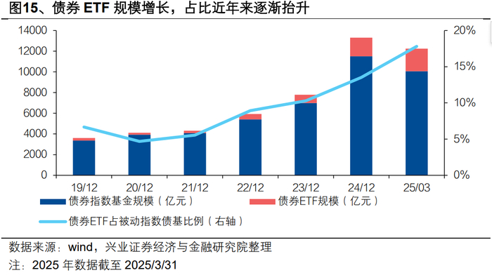近年来被动投资得到青睐,被动指数型债基快速扩张。2018年资管新规落地后,持仓透明的被动指数型债基开始受到银行等投资者青睐,规模占比开始大幅提升。2021年开始至今在全部债基中,被动指数型债基规模占比也逐年上升,截至2025年3月31日规模达到1.22万亿元、占债基比例高达12.2%,虽然比2024年末略有缩减,但规模和占比均处历史较高位置。
