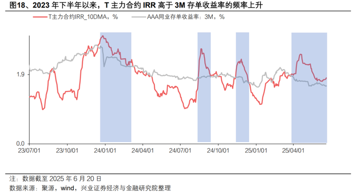 2)随着国债期货逐渐临近到期交割日,国债期货价格需要向现券收敛。若前期国债期货处于升水的状态,则随着国债期货逐渐临近到期交割日,正套策略/看多基差策略的机会可能显现。以10年期国债期货为例,2023年下半年以来,T主力合约IRR高于3M存单收益率的频率上升。2025年以来3月末以来,T主力合约IRR持续高于3M存单收益率,这意味着投资者持有T合约的最廉券,同时卖出T,持有至到期交割的收益持续高于持有3M存单的收益。
