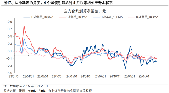 1)期货替代现券策略优势增强,国债期货出现升水的概率上升。和现券相比,持有国债期货没有票息收益,国债期货需要一定程度上反映投资者所损失的现券carry收益的机会成本。因此以往年份的大部分时间,国债期货基差处于正值区间,国债期货贴水。而当持有现券的carry降低之后,持有国债期货会损失票息和carry收益的机会成本下降,反而由于国债期货是保证金交易,节约资金的优势较为突出,期货替代现券策略的优势增强。市场对债市预期较为乐观的时候,国债期货升水幅度可能扩大。2025年4月以来,T、TF、TS的主力合约基差均处于负值区间。而从净基差的角度,4个国债期货品种4月以来均处于升水状态。