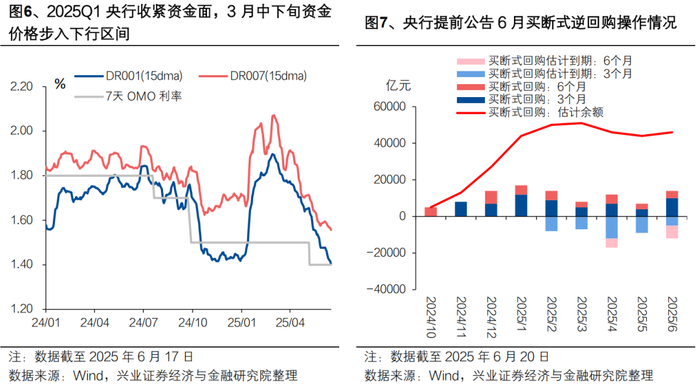 央行对流动性的呵护态度明显,3月中旬以来资金价格呈现下行趋势。3月中旬以来央行对流动性的呵护态度明显增强,3月下旬央行公告调整MLF招标规则并超量续作3月MLF,5月双降落地释放了万亿长期流动性,6月央行又两次提前公告了合计1.4万亿元的买断式逆回购操作,进一步释放了对资金面的呵护信号。资金价格是央行态度最根本的体现,3月中旬以来资金利率开启下行趋势,近期DR001已经下至1.4%下方,移动平均口径下DR001也逐渐向1.4%的政策利率收敛。