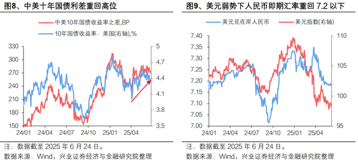 货币政策面临的约束减弱,下半年还有加码的空间,资金利率也有望进一步下行。当前中美国债利差重回高位,原因在于美国国债利率上行更多由于美国信用风险抬升、而非过去两年的通胀“高烧不退”,近期美元走弱下人民币被动升值,人民币兑美元即期已重回7.2以下,汇率因素对货币政策的约束减弱。5月7日国新办发布会央行重申今年要实施适度宽松的货币政策,不过当前政策初衷是稳市场、稳预期,5月央行降息10BP的幅度相对克制,这为后续基本面变化保留政策空间。随着货币政策面临的约束减弱,关税对基本面的影响逐渐显现,我们预计下半年还有进一步降准降息的可能性,资金利率也有望进一步下行。