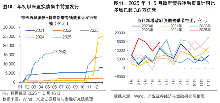 今年以来置换债集中发行,地方财政重心可能仍集中在化债化险。从财政发力的节奏上看,今年政府债发行节奏上整体前置,1-5月政府债券净融资累计同比多增已超3.8万亿元。其中,地方债发行节奏明显加快,尤其是置换债集中前置发行,今年以来发行的用于化债的特殊再融资专项债发行超1.6万亿元,当前地方财政层面的工作重心可能仍集中在化债化险。