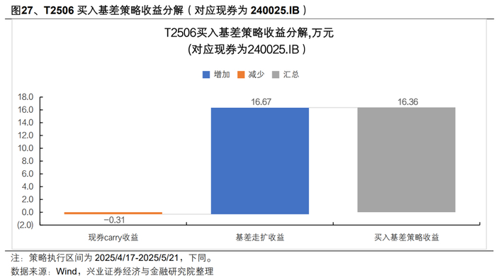 2025年4月美国对华加征“对等关税”后,资本市场风险偏好下行,长债收益率快速下行,市场对债市预期较为乐观,国债期货进一步升水,T2506的IRR明显高于3M存单收益率,正套/看多基差策略空间打开。假设投资者决定于2025年4月17日执行10年期国债期货的看多基差策略,5月21日,随着T2506不再是主力合约,投资者在期货和现券两端平仓。