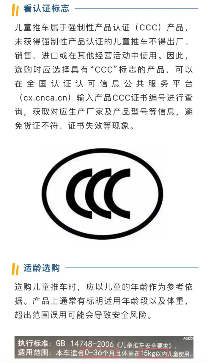 消费者应仔细阅读说明书,正确掌握折叠和制动的使用方法;当儿童乘坐推车时,必须使用安全带;上下坡停车时,确保制动装置生效,防止发生溜车等意外;不在乘坐扶梯时使用推车;不在推车上外挂重物或放置过多物品,不超出限制重量使用,避免倾翻。