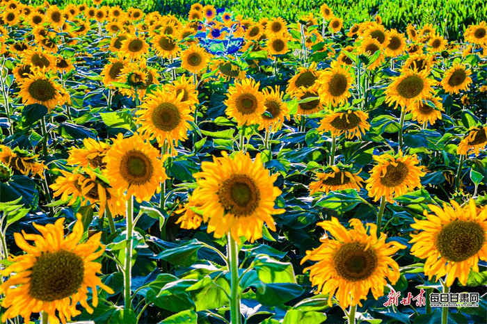 仲夏时节,敦煌市黄渠镇常丰村变身金色童话世界。千亩向日葵迎着骄阳次第盛放,金灿灿的花盘缀满枝头,在微风中摇曳生姿,与蓝天白云、远处的祁连雪峰相映成趣,勾勒出一幅壮阔而绚丽的田园画卷。