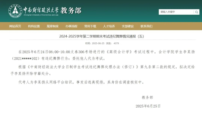 6月25日,中南财经政法大学官网通报:在2025年6月24日08:00-10:00文泰306考场进行的《高级会计学》考试过程中,会计学院学生李某扬(2021*****102)有违纪舞弊行为:委托他人代为考试。